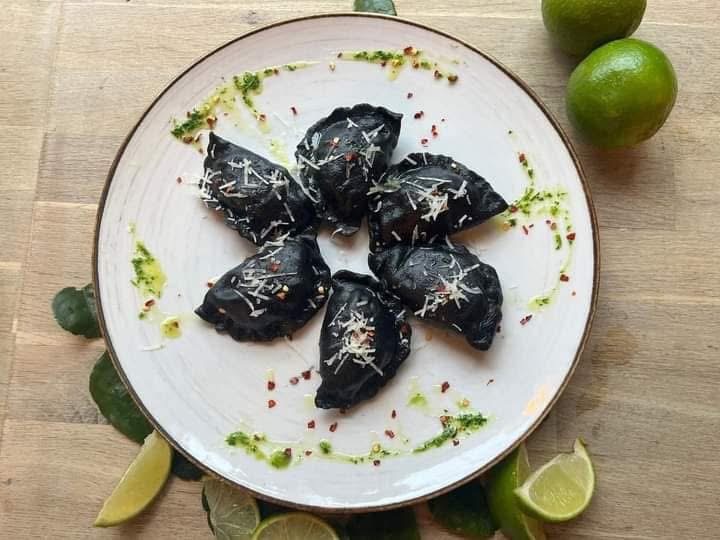 Pierogi meksykańskie z salsą pomidorowo-paprykową, śmietaną i kolendrą
